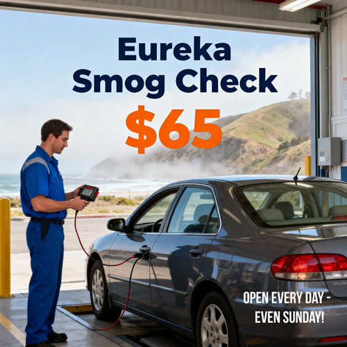 Fast turnaround. Located at 1329 4th Street in Eureka, open daily 7:30 am–6:00 pm including Saturdays. Walk‑ins welcome, or book online for $65 Smog Checks serving Eureka, Arcata, McKinleyville, Fortuna, and all of Humboldt County.